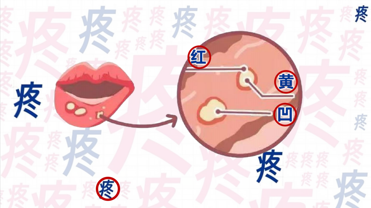 典型的溃疡以“红、黄、凹、痛”为特征,常表现为米粒或者黄豆大小,呈圆形或椭圆形,表面覆盖黄色假膜,周围有红晕带,中间是凹下去的。口腔溃疡发作时疼痛剧烈,局部灼痛明显,严重影响饮食、说话,对日常生活造成极大不便。