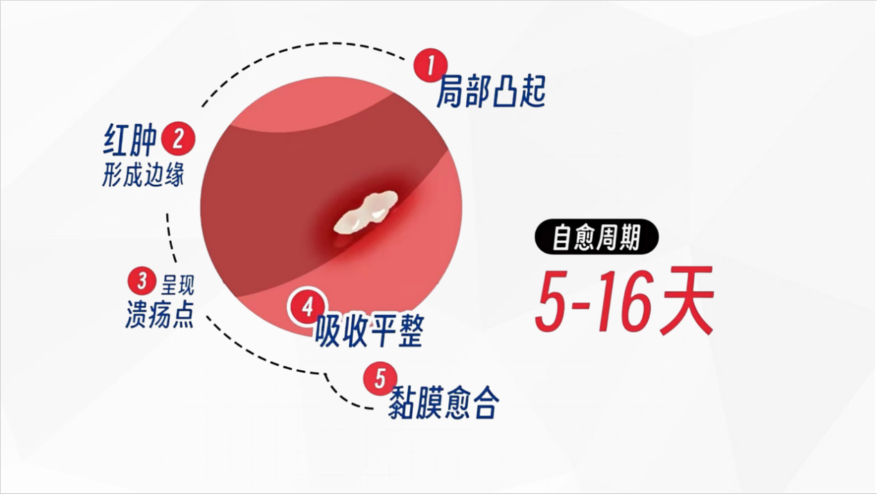 溃疡的形成会经历局部凸起、红肿边缘化、溃疡点呈现、吸收平整到黏膜愈合这5个阶段,坏死的细胞最终会被新的细胞填补,大概5-16天,2周内自行痊愈。