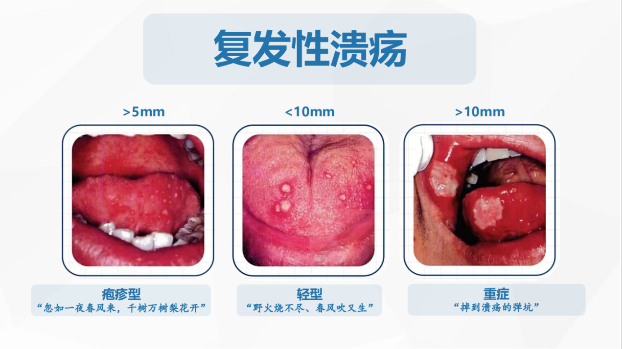 如果经常出现溃疡,一个溃疡刚好,隔几周又出现新的溃疡,甚至会同时出现几批不同周期的溃疡,且无法明确原因,这一类溃疡被称之为“复发性阿弗他溃疡”,可分为轻型、疱疹型和重型,其中轻型的特点是“野火烧不尽、春风吹又生”,溃疡孤立或散在存在,溃疡比较浅表;疱疹型的特点为“忽如一夜春风来,千树万树梨花开”,“满天星”一样的溃疡,小而多,位置表浅,常散在分布或融合成片;重型溃疡被称之为“掉到溃疡的弹坑”,溃疡大而深,就像“火山口”或“子弹坑”,持续时间长,疼痛剧烈,甚至会出现愈合瘢痕。