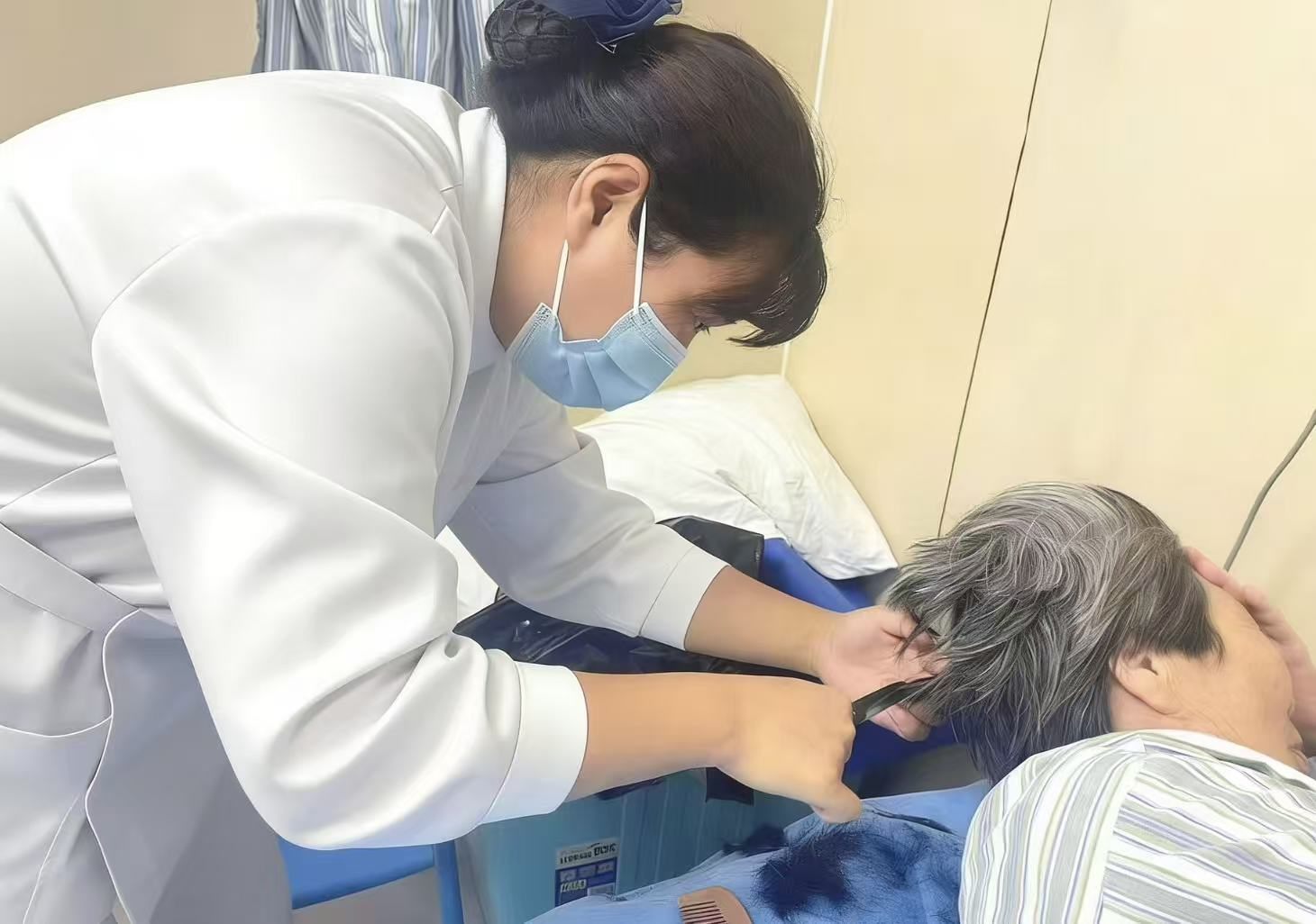 在病房的一隅,白衣天使俯身专注,为卧床患者细心修剪头发。没有豪言壮语,只有指尖传递的温柔与耐心,让长者在整洁舒适的仪容中,感受被尊重与被珍视的温度。