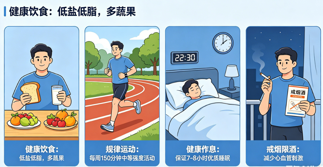 1. 严控血压:给血管“减压”,预防的核心操作。高血压就像一股不停冲击主动脉壁的“洪水”,长期冲刷会让血管弹性越来越差、慢慢硬化,最终导致内膜撕裂。临床数据显示,70%以上的主动脉夹层患者,都有高血压病史,控住血压,就抓住了预防的核心。日常要定期测血压,要是确诊高血压,一定要遵医嘱规律吃药,千万别凭感觉自行停药、调药量;把血压稳定在目标范围,才能减少血流对血管壁的冲击力;同时少吃盐、规律作息,避免熬夜、情绪波动让血压像“过山车”一样骤升骤降。