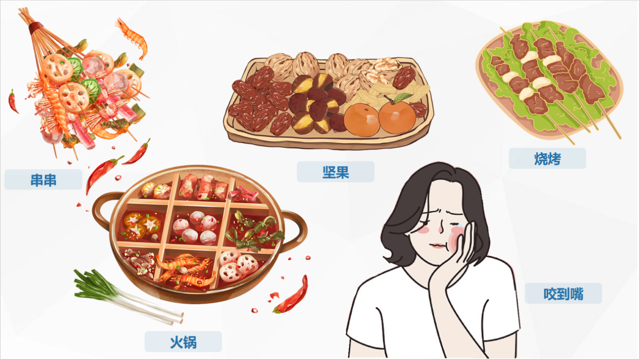 (1)养成良好的生活习惯:建议戒烟戒酒,纠正咬舌、咬颊等不良习惯,避免辛辣刺激性食物,比如火锅、烧烤、串串香,清淡饮食,荤素搭配,营养均衡。