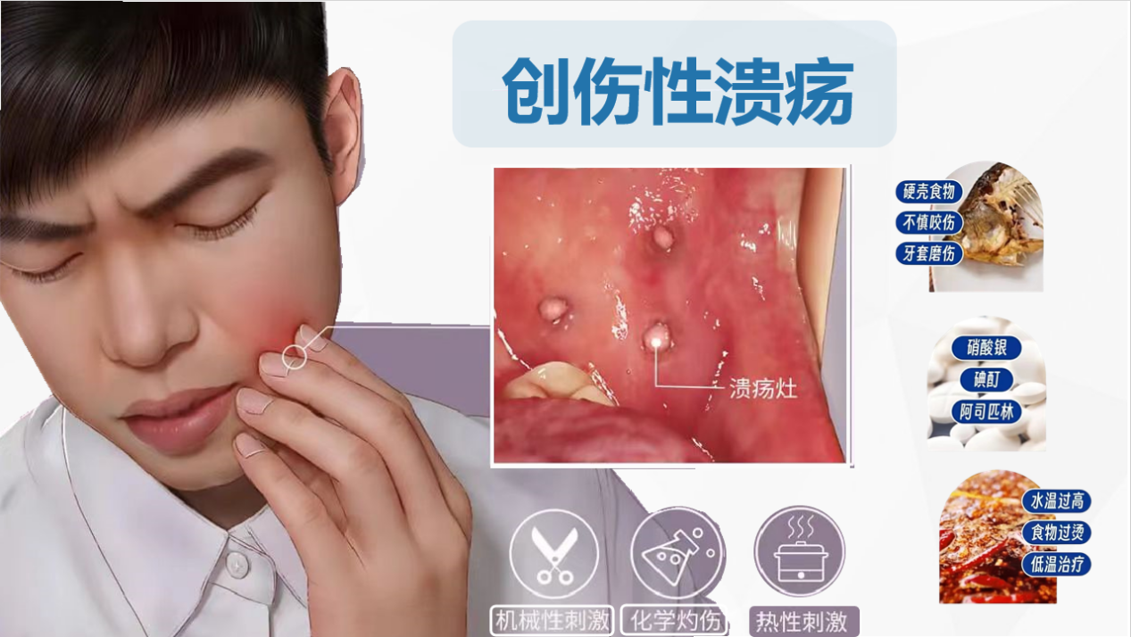 当然,除了吃以外,还有很多情况也可能会磨破我们的口腔而导致溃疡,主要包括机械性损伤、化学性灼伤、冷热刺激等因素。如果,每次我们都能明确说出口腔溃疡的原因,那我们发生的溃疡就是单纯的创伤性口腔溃疡。