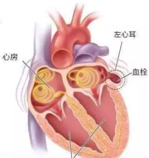 当心房不能有效收缩时,血液容易在左心耳(心房的一个小角落)滞留,就像水流缓慢的河湾容易沉积泥沙一样。滞留的血液可能凝结成血栓。一旦血栓脱落,就会随着血流进入大脑,堵塞脑血管——这就是缺血性脑卒中(占所有脑卒中的80%以上)。