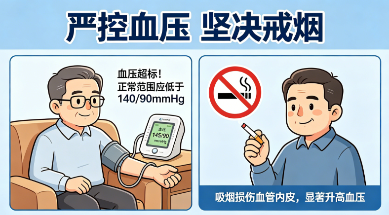 1. 严控血压:给血管“减压”,预防的核心操作。高血压就像一股不停冲击主动脉壁的“洪水”,长期冲刷会让血管弹性越来越差、慢慢硬化,最终导致内膜撕裂。临床数据显示,70%以上的主动脉夹层患者,都有高血压病史,控住血压,就抓住了预防的核心。日常要定期测血压,要是确诊高血压,一定要遵医嘱规律吃药,千万别凭感觉自行停药、调药量;把血压稳定在目标范围,才能减少血流对血管壁的冲击力;同时少吃盐、规律作息,避免熬夜、情绪波动让血压像“过山车”一样骤升骤降。