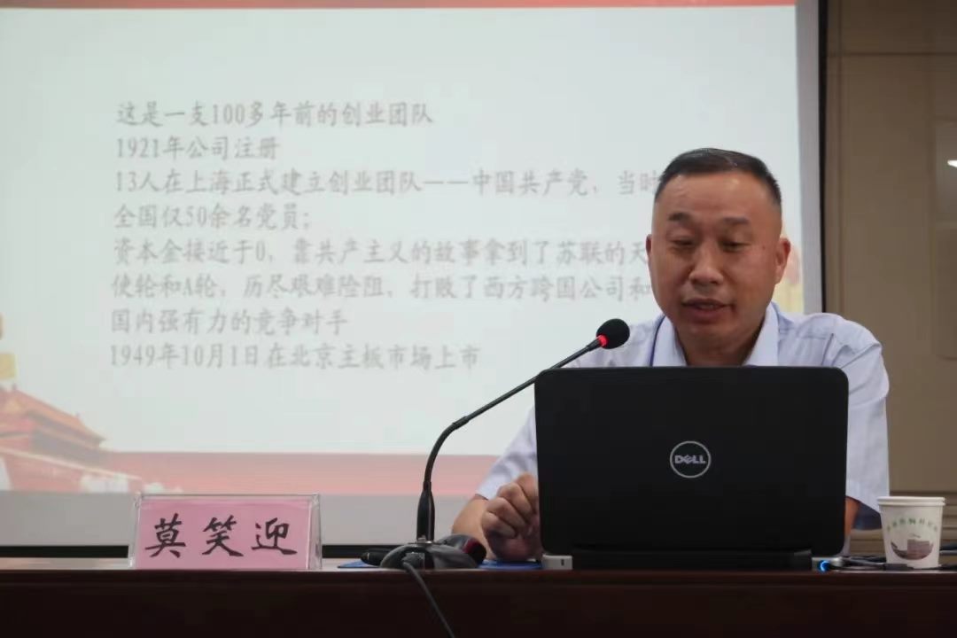 院党委副书记、副院长莫笑迎,从“苦难中的辉煌”“历史的选择人民的选择”“最好的时代和最坏的时代”“不忘初心为人民砥砺前行奔小康”四个方面,讲述了中国共产党在新民主主义革命、社会主义革命和建设的改革开放、开创和发展中国特色社会主义、推进中国特色社会主义新时代及全面建成小康社会的百年奋斗历史,要求每个党员铭记中国共产党初心和使命,通过学史明理、增信、崇德、力行,坚定理想信念,要始终做到政治上讲忠诚,组织上讲服从,行动上讲纪律。践行全心全意为人民服务宗旨,敢于担当勇于负责,树立新形象,传递正能量,每名党员都要成为一面鲜红的旗帜,每个支部都成为党旗高高飘扬的战斗堡垒。为增进人民健康福祉、提高人民健康水平,为党的卫生健康事业,为中华民族的伟大复兴的中国梦努力奋斗!